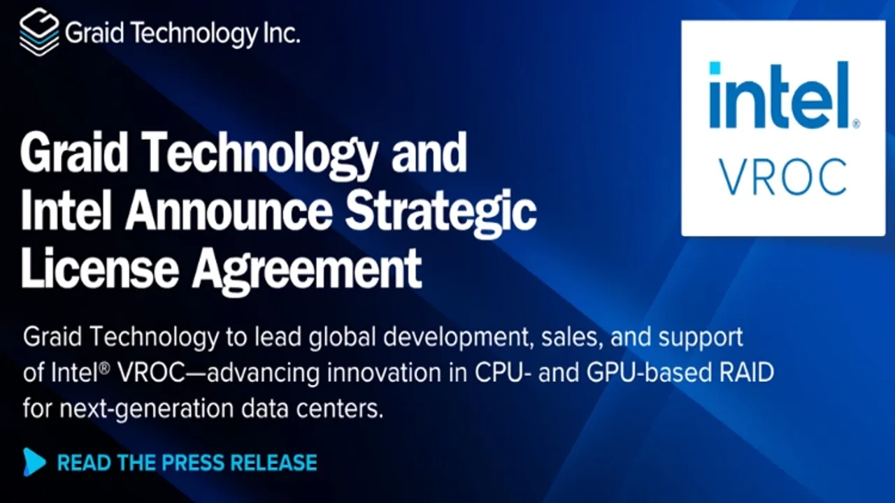 Graid Technology, RAID inovasyonunu hızlandırmak için Intel Corporation ile stratejik lisans anlaşması imzaladı. Stratejik iş birliği, kurumsal RAID pazarında inovasyonu hızlandırması ve dünya genelindeki veri merkezi müşterileri için dönüştürücü sonuçlar sunacak.ACCESS Newswire / SANTA CLARA, KALİFORNİYA (İGFA) - Graid Technology, Intel Corporation ile yaptığı lisans anlaşması kapsamında, Intel® Virtual RAID on CPU (Intel® VROC) teknolojisini küresel ölçekte geliştirme, pazarlama, satış ve destekleme haklarını elde ettiğini duyurdu. Bu stratejik iş birliğinin, kurumsal RAID pazarında inovasyonu hızlandırması ve dünya genelindeki veri merkezi müşterileri için dönüştürücü sonuçlar sunması bekleniyor.
