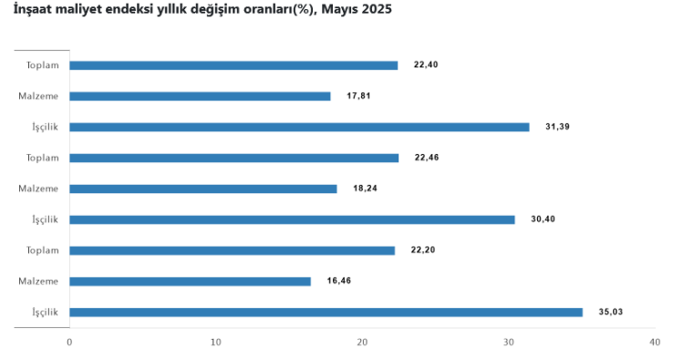 Bina inşaatı maliyet endeksi, aylık yüzde 0,81, yıllık yüzde 22,46 artış kaydetti. Malzeme endeksi aylık yüzde 1,08, yıllık yüzde 18,24 artarken, işçilik endeksi aylık yüzde 0,35, yıllık yüzde 30,40 yükseldi.