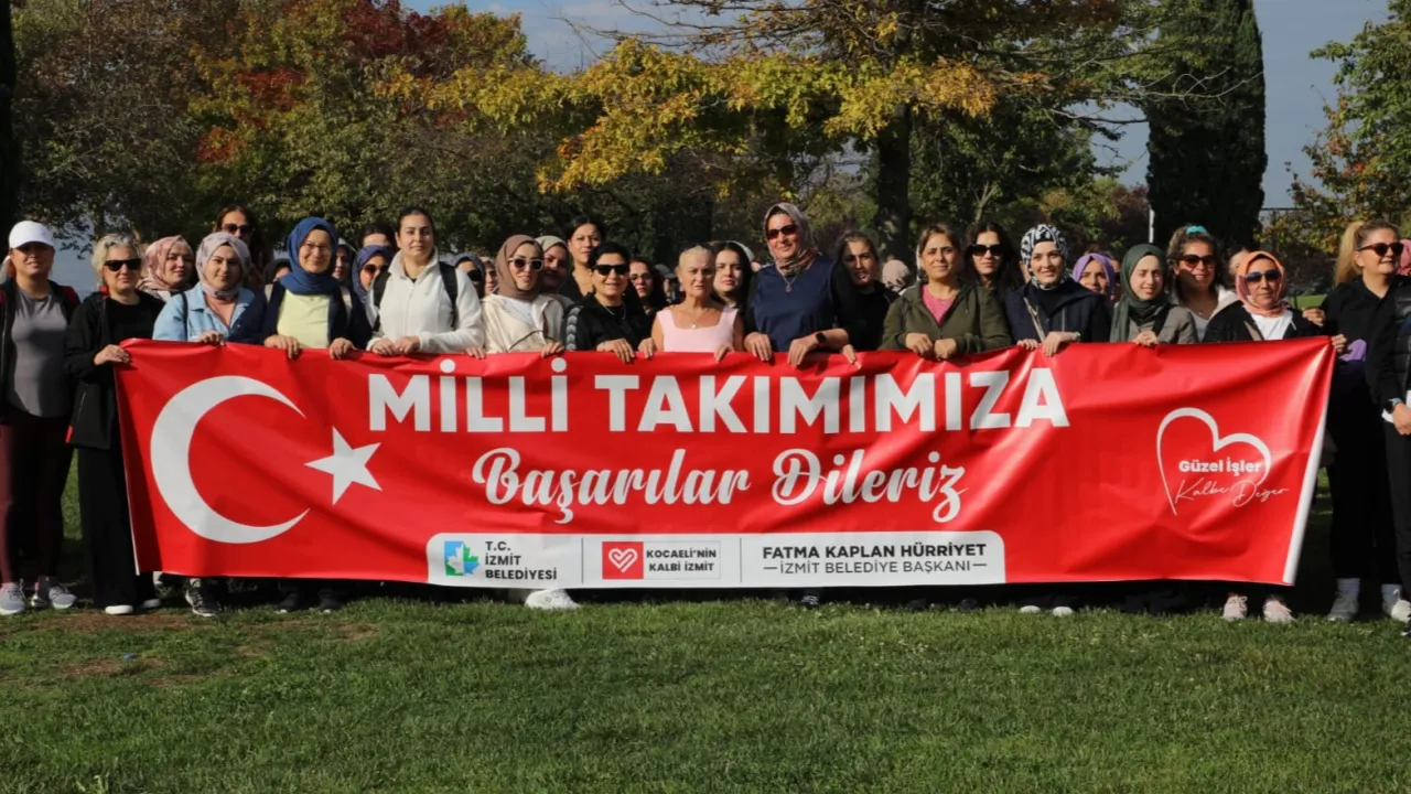 İzmit Belediyesinin düzenlediği sağlıklı yaşam yürüyüşü etkinliğinde, katılımcılar bu akşam kentimizde oynanacak Türkiye–Gürcistan maçında milli takıma başarı dilemek için destek pankartı açtıKOCAELİ (İGFA) - İzmit Belediyesi Spor İşleri Müdürlüğü, kadınlara yönelik açık hava spor etkinliklerine hız kesmeden devam ediyor. Sağlıklı yaşam yürüyüşleri kapsamında SEKA Park’ta düzenlenen etkinlikte, uzman spor eğitmenleri eşliğinde yürüyen kadınlar hem keyifli vakit geçirdi hem de güzel havanın tadını çıkararak spor yapma fırsatı buldu.