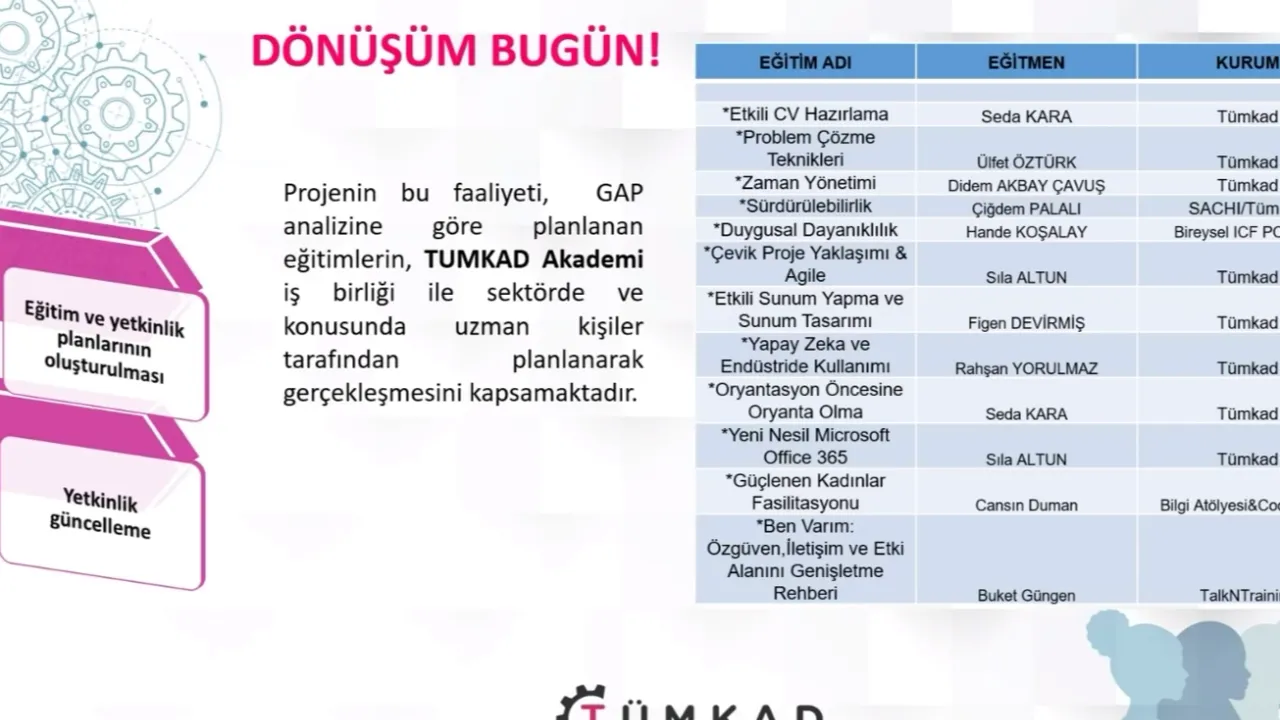 TÜMKAD Yönetim Kurulu’nun ve üyelerinin katıldığı toplantının açılış konuşmasını yapan TÜMKAD Yönetim Kurulu Başkanı Ülfet Öztürk, konuşmasında hem projenin başlangıcındaki heyecanı hem de bugüne kadar geçen süreçte yaşanan gelişmeleri aktararak, “Bugün burada sadece bir projenin kapanışı için değil, çok daha büyük bir hikayenin devamı için bir araya geldik. ‘Dönüşüm Bugün’ projesini başlatırken amacımız çok netti. Belirli nedenlerle sektörden ayrılmış kadın mühendislerimize, mesleklerine dönüş yolculuklarında destek olmak istedik. Çünkü biliyoruz ki, sektörden ayrılan her kadın mühendisle birlikte toplumun üretim gücü ve ülkenin potansiyeli de azalıyor” dedi.