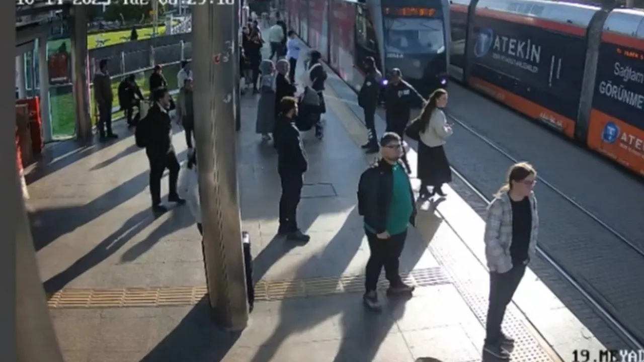 Cumhuriyet Meydanı Raylı Sistem İstasyonu’nda karşıya geçmek isteyen genç bir yolcu, kulaklık taktığı için yaklaşan tramvayı fark etmedi. O esnada görev başında olan güvenlik personelinin hızlı refleksi sayesinde genç yolcu raylara girmeden son anda durdurularak olası bir kazadan kurtarıldı.