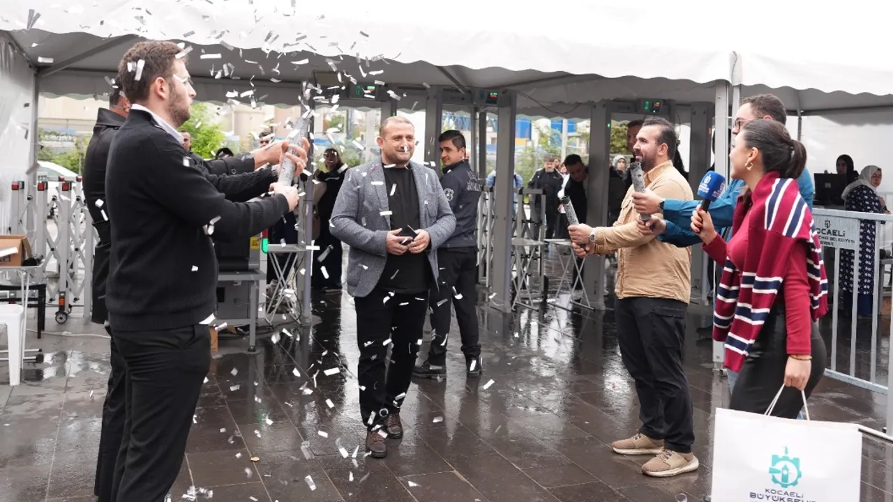 Uluslararası 15. Kocaeli Kitap Fuarı’nın 1 milyonuncu ziyaretçisi olan Fuat Uçan, konfetilerle karşılandı. Uçan, “1 milyonuncu ziyaretçi olduğum için hem mutlu hem de gururluyum” dedi.KOCAELİ (İGFA) - Kocaeli Büyükşehir Belediyesi’nin bu yıl “Anadolu Mayası” temasıyla düzenlediği Uluslararası 15. Kocaeli Kitap Fuarı son gününde de yoğun bir ilgi görüyor. Yağışlı havanın da engel olmadığı kitap tutkusuyla dopdolu geçen Kocaeli Kitap Fuarı, 1 milyonuncu ziyaretçisini öğle saatlerinde ağırladı. Bu kapsamda fuarın 1 milyonuncu ziyaretçi Fuat Uçan oldu. Kocaeli Kongre Merkezi’nin üst yol gişelerinden fuar alanına giriş yapan Fuat Uçan, fuarın 1 milyonuncu ziyaretçisi olduğunu sürpriz bir şekilde öğrendi.