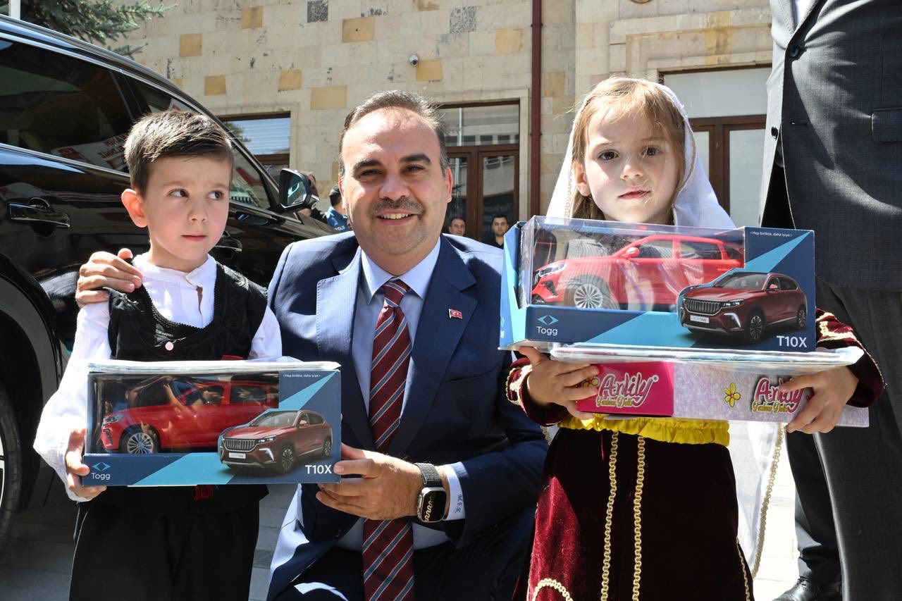 Sanayi ve Teknoloji Bakanı Mehmet Fatih Kacır ,Çocukların çiçek sunumuyla karşılandı.